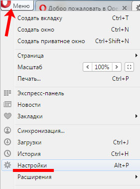 Клікніть по кнопочці «Меню» в лівому верхньому куті з логотипом Опери і перейдіть в «Налаштування».