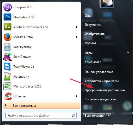 Якщо взяти для прикладу операційну систему Windows 7, то там це робиться наступним чином. Тиснемо на кнопочку «Пуск» і з випав списку вибираємо пункт «Програми за замовчуванням»: