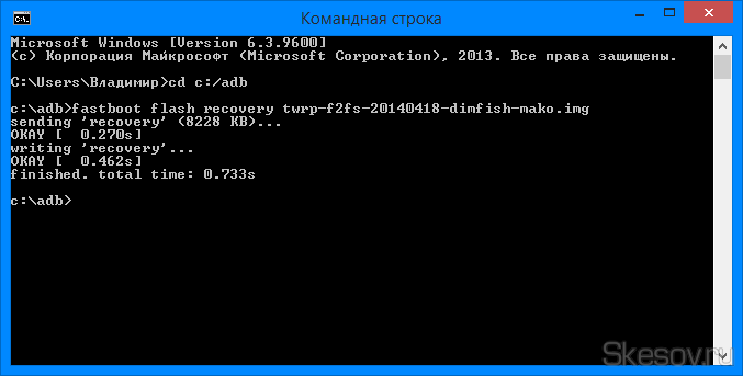 fastboot flash recovery twrp-f2fs-20140418-dimfish-mako.img