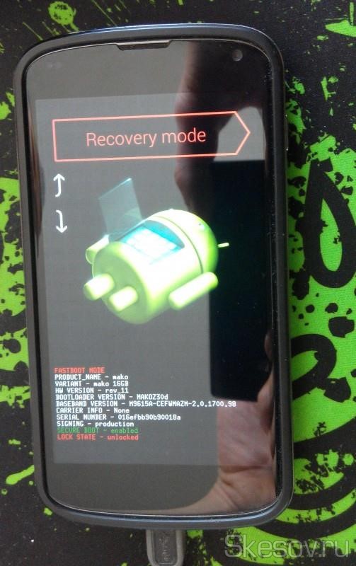 4) Клавішами гучності вибираємо пункти меню в режимі fastboot, поки не з’явиться Recovery mode. Тиснемо клавішу живлення для входу в рекавері.