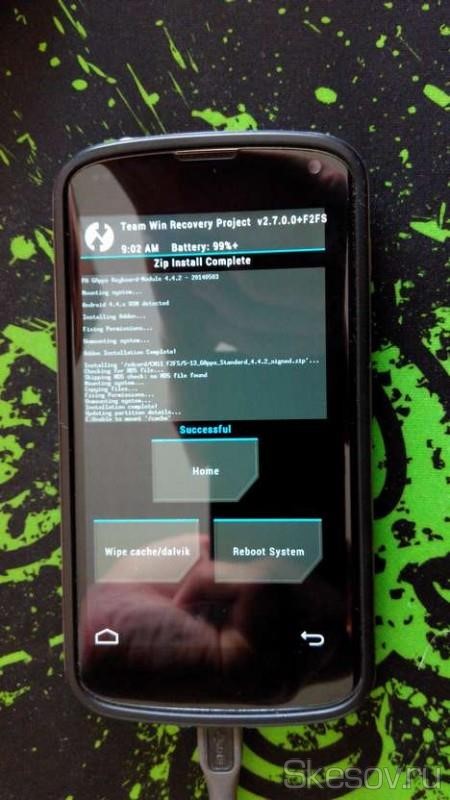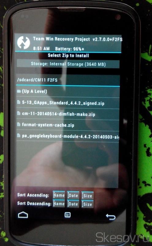 яндекс.диск dimfish — відкриваємо і викачуємо наступне: twrp-f2fs-yyyymmdd-dimfish-mako.img (рекавері TWRP з підтримкою F2fs), format-system-cache.zip скрипт для форматування, ну і файл прошивки, бажано найсвіжіший на даний момент.