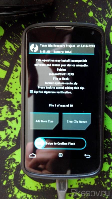 Підтримка даної файлової системи включена в ядро Linux починаючи з версії 3.8. У сирому вигляді CyanogenMOD не дозволяє використовувати дану файлову систему, тому його потрібно допілівать. Але, на щастя, товариш dimfish вже все зробив для нас, і тепер нам залишилося тільки правильно встановити операційну систему. Відразу попереджаю, що абсолютно всі дані з телефону зітруться, тому про всіляких бекапах краще подумати заздалегідь (Google-аккаунт для контактів, Titanium backup для програми і руки для добування важливих фотографій). Якщо все важливе вже зберегли і в щирості своїх рук впевнені, то приступаємо. Але нагадую, що прошивка телефону — це в деякій мірі завжди лотерея, і за ваш телефон відповідаєте тільки ви. Ви можете його розбити!