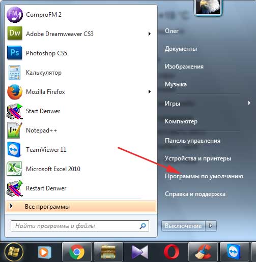 Для прикладу, візьмемо операційну систему Windows 7. Натискаємо «Пуск – Програми за замовчуванням» або шукаємо даний пункт через «Пошук»: