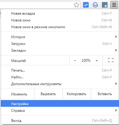 Натискаємо на кнопочку меню у вигляді трьох паличок, яка знаходиться в правому верхньому кутку, і з випав списку вибираємо пункт «Налаштування»: