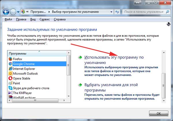 У віконці з лівого боку у нас підвантажується список встановлених програм, в якому ми знаходимо наш улюблений браузер. Виділяємо його і, з правого боку, тиснемо на кнопочку «Використовувати програму за замовчуванням»: