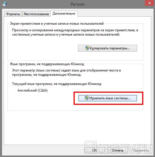 З’явиться вікно вибору регіональних налаштувань. Тут тиснемо кнопку «Змінити мову» в розділі «Мова програм, які не підтримують Юнікод».