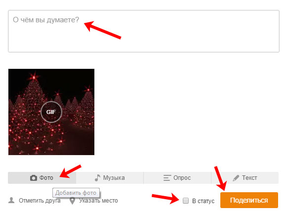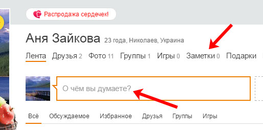 Тепер давайте розберемося, як завантажити діфку в Однокласники, яка зберігається на вашому комп’ютері. Зайдіть на свою сторінку в соціальній мережі. Додавати анімацію потрібно через замітки, тому можете або клікнути по відповідному пункту меню під своїм іменем, або відразу натиснути в полі «Про що ви думаєте?».