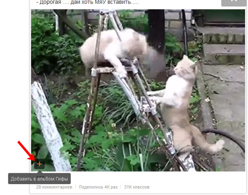 Якщо ви побачили цікаву діфку на сторінці одного, у стрічці або в групі, додати її до себе в профіль можна наступним чином. Просто наведіть курсор мишки на зображення, натисніть на плюсик в лівому нижньому кутку. Гифка буде додано до вас у відповідний альбом і у новинну стрічку.