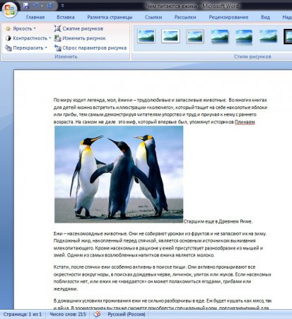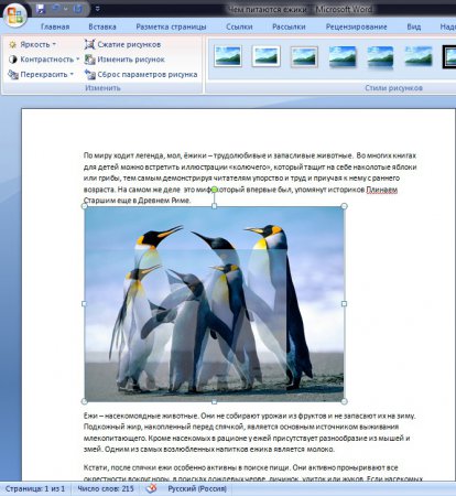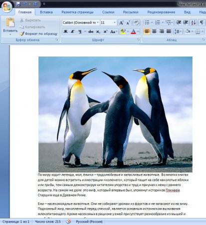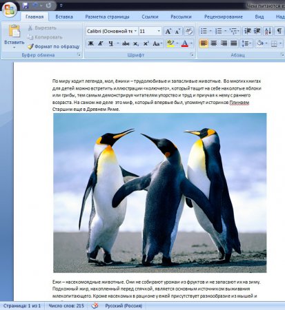 Картинка з пінгвінами помістилася в те місце, де я останній раз ставив курсор. Її положення в тексті легко виправити – затисніть картинку лівою кнопкою миші і перетягніть її в потрібне місце. Я переставлю таким способом картинку і поставлю її перед другим абзацом.