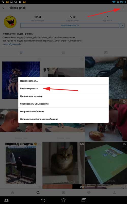 Заходимо знову на його сторінку, знову натискаємо на меню в правому верхньому кутку і з випав списку вибираємо пункт «Розблокувати».