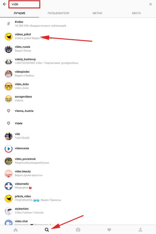 Давайте спочатку знайдемо акаунт того чоловіка, якого будемо блокувати. Якщо ви не можете знайти його серед своїх передплатників, спробуйте скористатися пошуком. В нижньому меню натискаємо на значок лупи і в сточке пошуку вводимо логін товариша, якого будемо блокувати.