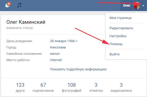 Клікаємо по верхньому меню (зі своєю миниаватаркой ) і з випав списку вибираємо пункт «Допомога»