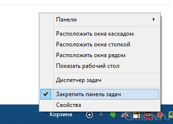 8) Клікаємо правою клавішею по панелі завдань і повертаємо галочку «Закріпити панель завдань», щоб позбавиться від вертикальних роздільників.