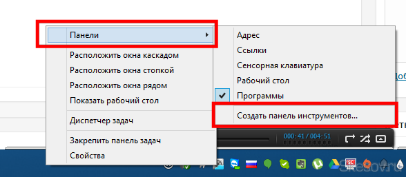 4) Натискаємо правою клавішею миші на панелі задач і вибираємо «Панелі» — «Створити панель інструментів».