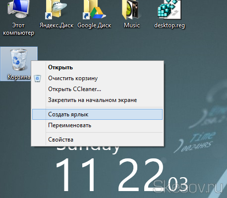 2) Натискаємо правою клавішею миші по кошику і тиснемо кнопку «Створити ярлик».