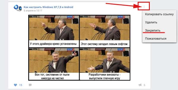 Знаходимо потрібну запис у себе на стіні або на стіні свого співтовариства. Тепер дивимося в правий верхній кут, там повинна бути невелика менюшка у вигляді трьох вертикальних точок. Натискаємо на неї і вибираємо пункт «Закріпити».Дивіться на скріншот, і вам все стане ясно: