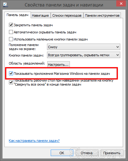 На першій вкладці Панель завдань». Потрібно поставити галочку в чекбокс «Показувати додатки з Магазину Windows на панелі завдань».