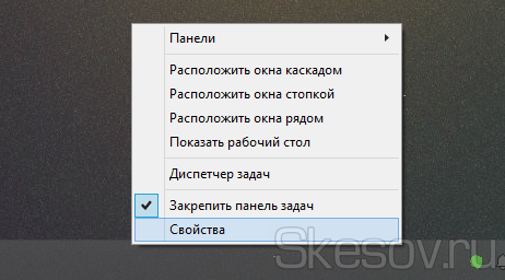 За замовчуванням, в системі відключено відображення сучасних програм на панелі завдань, відкриті програми можна побачити тільки в лівому бічному меню. Але, на щастя, це можна досить легко виправити. Для цього клікніть правою клавішею миші або використовувати довгий тап по панелі завдань в порожньому місці. І виберіть «Властивості».