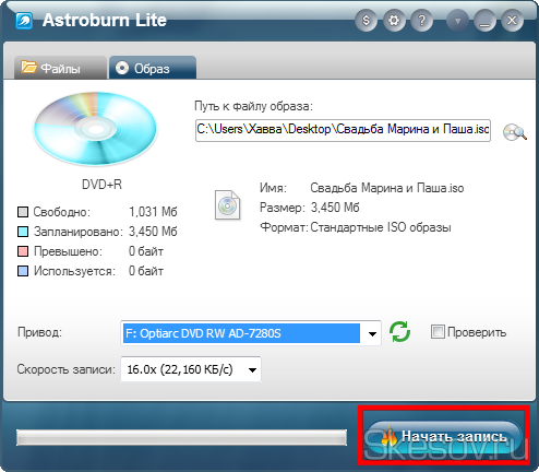 4) Вибираємо привід і швидкість запису відповідних випадають меню і тиснемо кнопку «Почати запис». При бажанні можна поставити галочку «Перевірити», щоб програма після завершення запису перевірила правильність записаних даних.