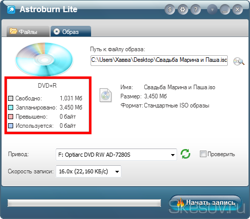 У лівій частині вікна програма покаже тип вставленого диска, скільки вільного місця залишиться після запису диску, скільки заплановано для запису, на скільки образ перевищує можливості диска.
