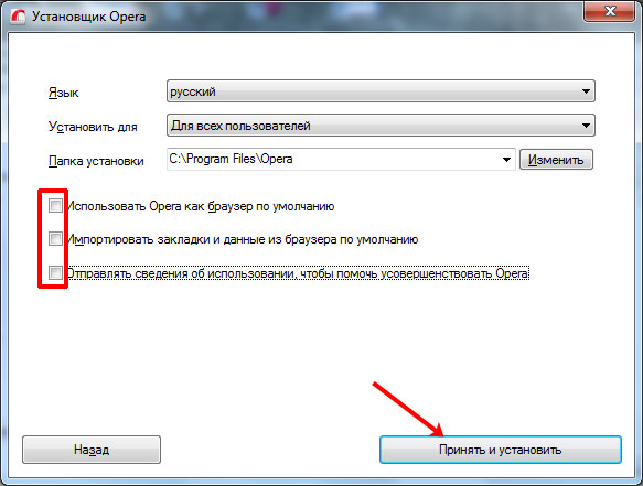 Тут можна вибрати мову, у кого з користувачів буде доступ до браузера і папку для установки. Трохи нижче, можна зробити Оперу браузером за замовчуванням, і перенести в неї всі закладки, які є у вашому поточному браузері.