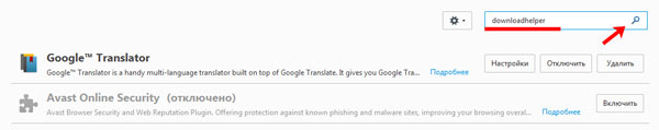 Відкриється сторінка, на якій ви побачите всі встановлені доповнення в браузері. Праворуч вгорі в рядок пошуку введіть «downloadhelper» і натисніть на лупу або кнопочку «Enter».