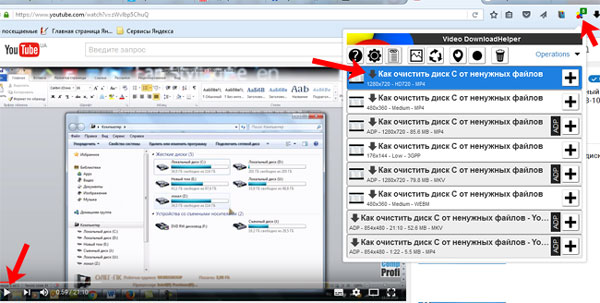 Для скачування відео з допомогою Video DownloadHelper, знайдіть потрібний файл і натисніть play. Розширення почне роботу, і кульки стануть кольоровими. Клікніть по кнопці розширення, виберіть з випадаючого списку відповідний дозвіл (1280х720, 480х360) і натисніть на нього.