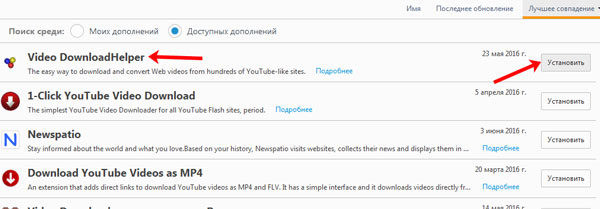 У списку доступних доповнень знайдіть Video DownloadHelper, зазвичай воно знаходиться вгорі списку, натисніть навпроти нього кнопочку «Встановити».