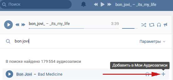 Пишемо виконавця або назву пісні, яку хочемо додати. Наводимо курсор миші на знайдену композицію і натискаємо на плюсик. Це означає дію «Додати в мої аудіозаписи»: