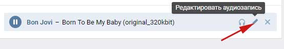 Деякі параметри доданих аудіозаписів вконтакте можна редагувати. Для цього достатньо навести курсор на аудіо і натиснути на «олівчик», що означає «Редагувати запис».