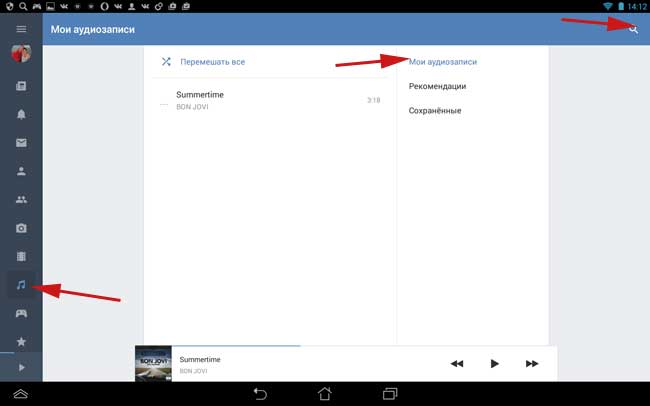 Зараз ми розберемося, як додаються пісні в плейлист з мобільного додатку. Запускаємо його. У лівому меню натискаємо на значок ноти, що означає «Аудіозаписи». Далі нам потрібна вкладка «Мої аудіозаписи» і в правому верхньому куті тиснемо на значок «Пошуку», щоб знайти потрібну нам композицію.