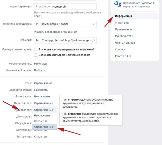 Далі у вкладці «Інформація» навпроти пункту «Аудіозаписи» поставити значення «Обмежені». Краще ставити так, тому що, якщо зробити їх повністю відкритими, то вашу групу можуть заспамить ж ваші передплатники. Тому краще злегка обмежити додавання, щоб це могли робити лише ви.