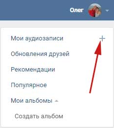 Щоб додати пісню вконтакте зі свого комп’ютера необхідно натиснути на «плюсик» навпроти вкладки «Мої аудіозаписи»: