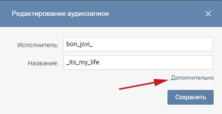 У нас відкривається віконце редагування аудиозапии, в якому ми можемо змінювати, як виконавця так і сама назва пісні. Давайте спробуємо натиснути на кнопку «Додатково»: