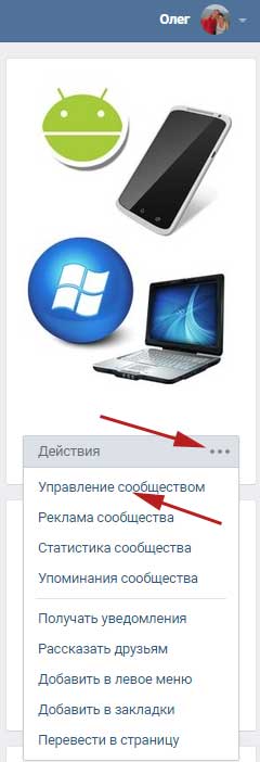 Якщо ви є власником групи вконтакте і бажаєте додати туди якусь аудіозапис, то зайдіть на головну сторінку і під аватаркою натисніть на меню групи у вигляді трьох горизонтальних точок. З випав списку натисніть на пункт «Управління спільнотою»: