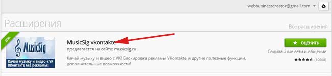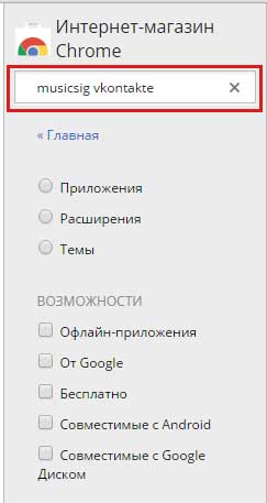 У нас відкривається Інтернет-магазин Хрому (не переживайте гроші там платити не потрібно) і в рядку пошуку розширень можете самі пошукати потрібну, задавши запит типу «завантажити відео вк», а можете скористатися досить класним багатофункціональним розширенням для хрому, що я вам пораджу. Мова йде про Musicsig vkontakte. Тому пишемо там відповідний запит: