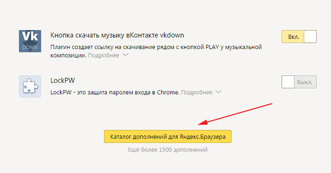 У новоствореній вкладці гортаємо всі наші доповнення в самий низ і тиснемо на кнопочку «Каталог доповнень для Яндекс.Браузера»: