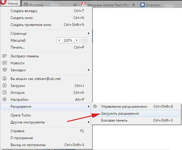 Запускаємо браузер Опера і натискаємо на кнопочку меню в лівому верхньому куті. З випав списку вибираємо пункт «Розширення – Завантажити розширення»