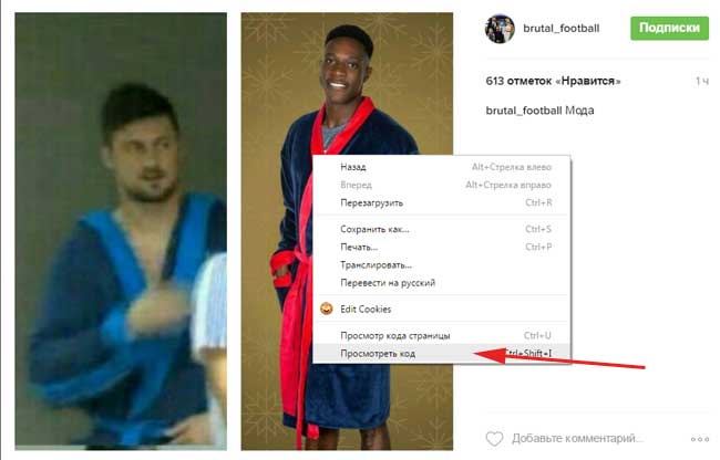 Заходимо на офіційний сайт Инстаграма і знаходимо те фото, яке хочемо зберегти. Клікаєм правою кнопкою по фото і з випавшого меню вибираємо пункт «Переглянути код.