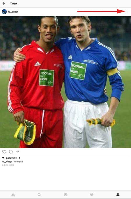 Після установки Regrann заходимо в свій Instagram з телефону і відкриваємо потрібний нам фото. У правому верхньому кутку фото натискаємо на меню у вигляді тих точок:
