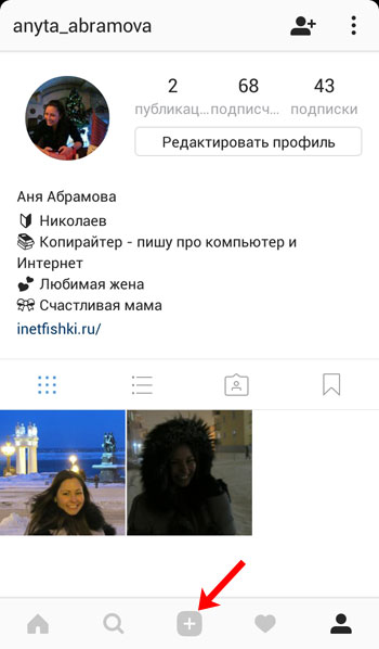 На телефоні або планшеті зайдіть в мобільний додаток Instagram і натисніть внизу на середню кнопочку із зображенням плюсик, щоб додати фото або відео.