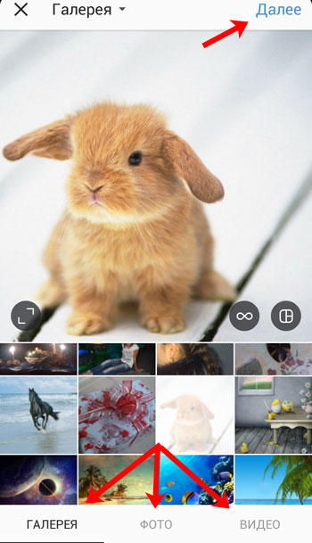Тепер можете зробити фото, зняти відео або вибрати що-небудь з вкладки «Галерея». Я вибрала фотографію з галереї, тому натискаю «Далі».