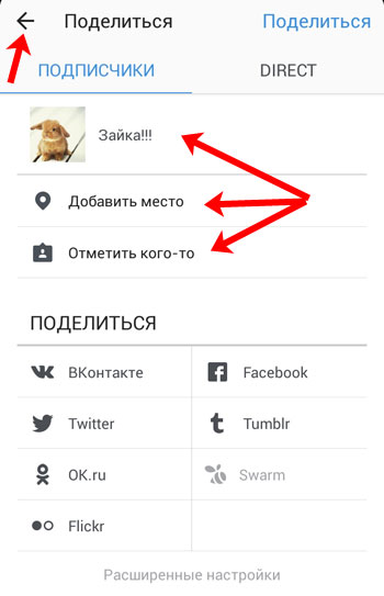 Додайте підпис, місце і позначте, якщо потрібно, інших людей. Після цього, натисніть на стрілочку «Назад», у лівому верхньому куті.