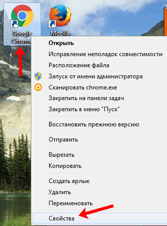 Знайдіть ярлик Хрому на робочому столі і клацніть по ньому правою кнопкою миші. Виберіть з контекстного меню пункт «Властивості».