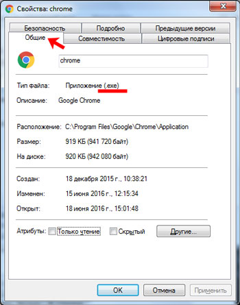 Знаходимо тут потрібний файл. Щоб не було сумнівів, клікніть по ньому правою кнопкою миші і зайдіть в «Властивості». На вкладці «Загальні» у полі «Тип файлу» має стояти розширення .exe.