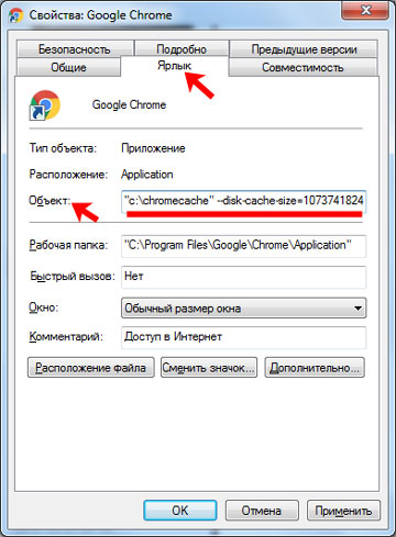 У вікні властивостей на вкладці «Ярлик». В полі «Об’єкт» поставте курсив в кінці, натисніть пробіл і вставити: —disk-cache-dir=»c:с?гомесас?е», знову пробіл і: —disk-cache-size=1073741824. Натисніть «Застосувати» і «ОК».