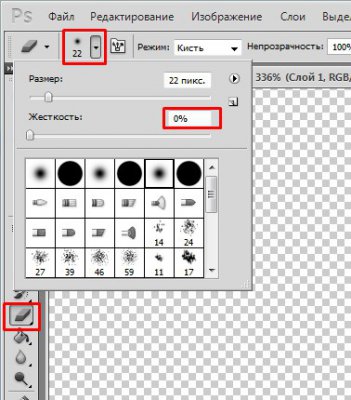Вибираємо Ластик (або натискаємо Е), в параметрах вказуємо Жорсткість 0, а розмір обираєте самі, потрібно, щоб воно не захоплювало зайве, щоб краї не були потім прозорими.