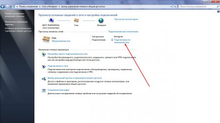 3. Потім знаходимо розділ “Перегляд активних мереж“, який візуально розділений на дві частини за допомогою горизонтальної лінії. Вам необхідна права частина цього розділу, в якій знаходиться “Тип доступу” і “Підключення”. Навпроти останнього у вас встановлено “Підключення по локальній мережі” (написано блакитним шрифтом, а поруч зображений коннектор). Натисніть на цей напис.
