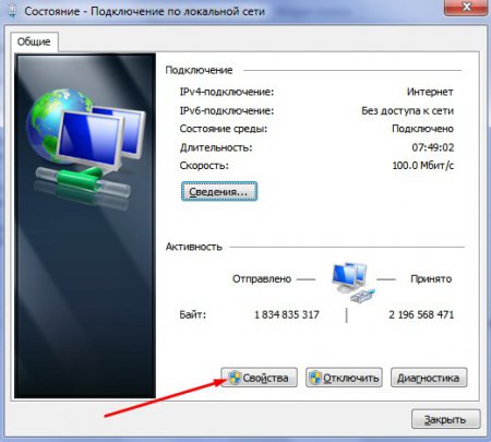4. Відкриється діалогове вікно “Стан – Підключення по локальній мережі“. Відшукайте кнопку “Властивості” і натисніть на неї.
