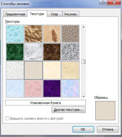 Текстура – дозволяє використовувати одну з доступних текстур як фон для сторінки. Якщо ви не підібрали відповідну текстуру ви можете завантажити вподобану з Інтернету і залити в Word (за допомогою клавищи «Інша текстура»).